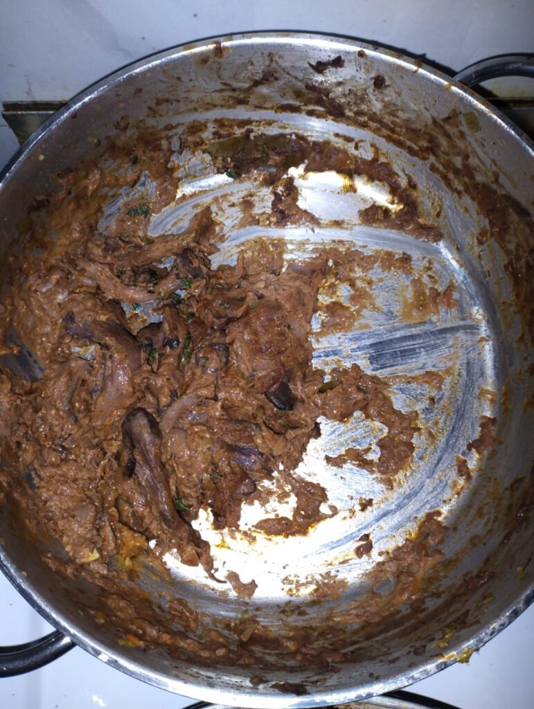 Tu sam još dodao malo soli, bibera, ljute mlevene paprike, lovorov list, crvenog vina (što bismo mi u Srbiji i komšije u Hrvatskoj jedini na svetu rekli crnog vina), pred kraj malčice pavlake za kuvanje da bi sve bilo kremasto, zatim belog luka pred samo skidanje sa ringle da se kuvanjem ne izgubi miris i ukus i na kraju, kad sam već skinuo sa vatre, peršunovog lista. Uh, u životu nisam napisao dužu rečenicu.
