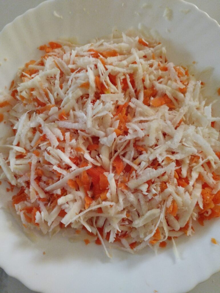 A onda sam narendao koren peršuna, celera i malo šargarepe iako šargarepa ima ugljenih hidrata, ne mnogo. I to može da se secka na mala geometrijska tela raznih oblika. Korenje sam dodao luku i posolio. Kažu stručnjaci koji pišu recepte po mrežama da kad se posoli brže omekša. Nemam pojma da li su u pravu. Sve to sam dinstao na tiho dok sam pisao ovaj tekst. Volim tako, na tiho.