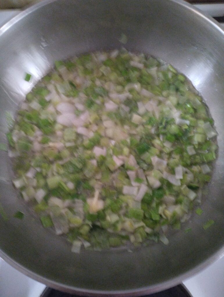 Prvo sam iseckao praziluk, imamo ga u bašti pa ga valja trošiti. Može i crni ili crveni luk na kockice ili neke druge geometrijske oblike. Svejedno. Malo sam ga prodinstao na masti. Imamo domaću pa i nju valja trošiti.